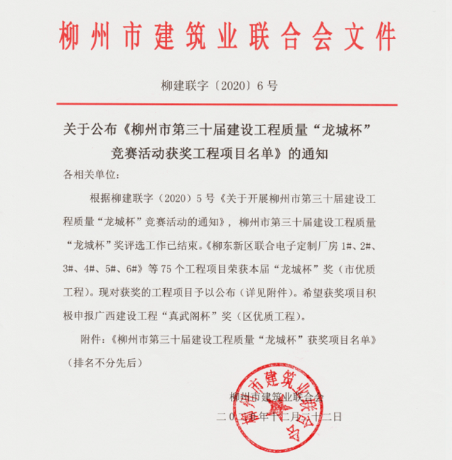 12月22日,柳州市建筑业联合会公布了《柳州市第三十届建设工程质量“龙城杯”竞赛活动获奖工程项目名单》,公司共有8个项目榜上有名。
