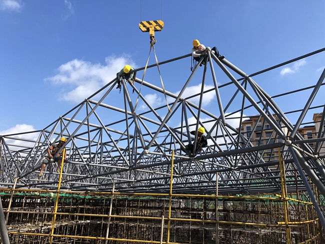 鹿寨县体育中心二期项目占地17313.5平方米,总建筑面积33012.7平方米,由运动场、体育馆、游泳馆三个大型单体建筑组成。“一场两馆”钢结构施工高峰期时,为解决作业面广、管理难度大的问题,项目实行工长片区责任制,每个场馆任命一位责任工长,全权负责所辖区域安全、质量、材料、设备及施工进度等问题。为保障工期,三位责任工长主动放弃周末和假期,拿出了“拼”的勇气、“赶”的节奏、“抢”的劲头认真管理现场,严格负责把控,保证每个场馆施工顺利进行。