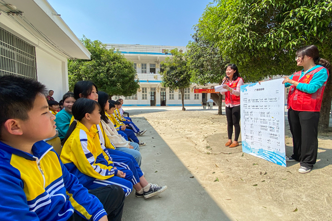 在活动现场,青年志愿者通过生动的事例、亲切的互动,打开了小学生的心扉,引导他们树立正确的人生观、价值观,要在学业上奋发图强,学有所成建设祖国和家乡。小学生们在志愿者的带领下,学会了《广西尼的呀》等特色民歌,动听的歌声响彻整个校园。活动现场还设立了吹乒乓球跳杯子、蒙眼睛敲锣、筷子夹玻璃珠、跳绳子等趣味游戏环节,小学生们在游戏中不仅赢得文具等丰富奖品,也收获了欢声笑语和满满成就感。