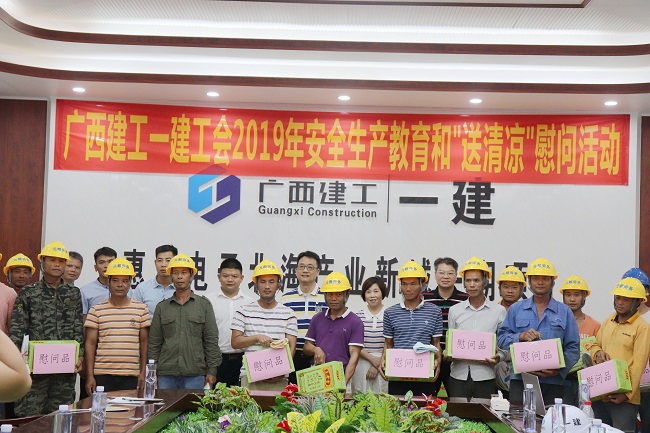 6月20日,广西建工集团第一建筑工程有限责任公司党委副书记、纪委书记、工会主席黄远奇带领慰问组到惠科电子北海产业新城一期项目开展2019年安全生产教育暨“送清凉”慰问活动。