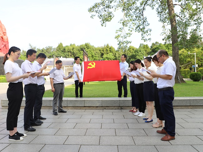 支部党员瞻仰李明瑞、韦拔群烈士纪念碑,参观南湖百色起义陈列馆,通过展馆内丰富的历史图片、实物等展示,大家重温了李明瑞、韦拔群等革命先烈的光辉事迹,深刻感受到中国共产党人血火淬炼的革命精神以及坚定信念。在纪念碑前,党员们面对鲜红的党旗,胸前佩戴党徽,庄严举起紧紧握住的右拳,重温入党誓词,合唱歌曲《我宣誓》,铿锵有力的句句誓言和歌声使党员在思想上再次得到了一次深刻洗礼。此外,党员同志们还在烈士纪念碑园旁分享学习心得,大家纷纷表示,要珍惜革命先辈们为我们争取的来之不易的新时代,要不忘初心、牢记使命,砥砺前行,立足本职工作、履职尽责创业,力争国庆节前实现PC基地建成投产。