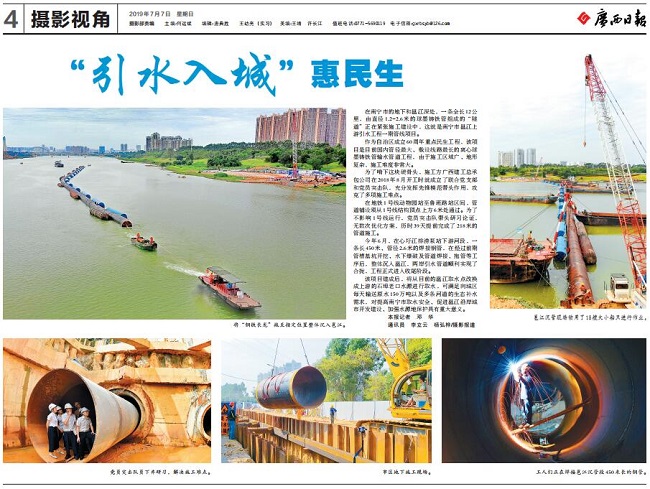 【7月7日,广西日报摄影视角版以图片新闻的形式,报道广西建工集团建筑工程总承包有限公司第二分公司承建的南宁市邕江上游引水工程一期管线工程,在项目党员突击队的带领下,成功完成项目重大施工节点、难点,并顺利进入收尾阶段的情况。现将全文刊载如下。】