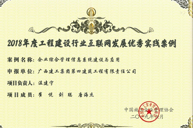 近日,中国施工企业管理协会在武汉召开第五届工程建设行业互联网大会,广西建工集团第四建筑工程有限责任公司申报的《企业综合管理信息系统建设与应用》获得2018年度工程建设行业互联网发展优秀实践案例。