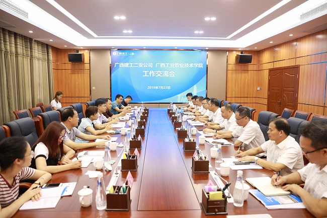 7月23日,广西工业职业技术学院党委副书记罗生芳一行12人到广西建工集团第二安装建设有限公司进行交流。二安公司党委书记、董事长潘海洪,在家领导班子黄水保、林建明出席交流会,副总经理、代总工程师莫雄清主持交流会。
