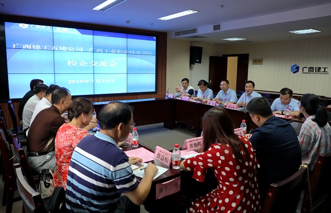 7月24日,广西工业职业技术学院党委副书记罗生芳率队到广西建工集团第五建筑工程有限责任公司考察交流。公司党委副书记、总经理蒙勇出席交流会。