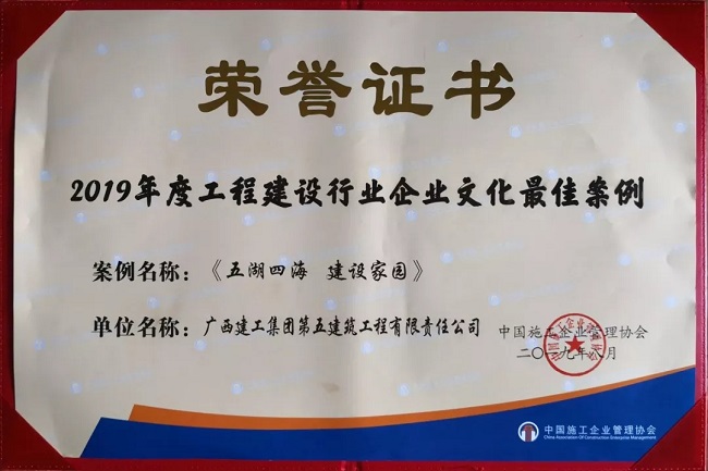 8月20日至22日,由中国施工企业管理协会主办的2019年度工程建设行业企业文化交流大会在天津举行,广西建工集团第五建筑工程有限责任公司荣获一项集体奖和三项个人奖,其中公司企业文化案例“五湖四海 建设家园”荣获2019年度工程建设行业企业文化最佳案例,是广西唯一获此殊荣的建筑施工企业。