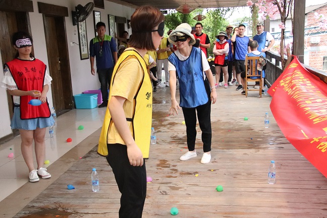 本次活动主要以训练团队精神为主,借助分组讨论、情景演练及“决战沙场”“精卫填海”等一系列团队活动,让大家真切体验拓展的魅力。在“决战沙场”项目,每队各自选出一名将军、参谋和若干名士兵。将军背对战场为盲人,参谋为哑巴,士兵既盲又哑,却是唯一可以进入战场的人。通过参谋和将军的协作指挥,士兵利用战场内的“手榴弹”攻击其他队伍的士兵,被击中者即为牺牲;但不能碰到战场上的地雷,触碰地雷,随即阵亡。在规定时间内以消灭敌人最快的队伍为胜。在“精卫填海”项目,每名队员手拿一根对半竖着裁开的钢管。通过钢管之间互相衔接传送乒乓球,乒乓球不能落地以及倒行,否则从头开始,速度最快者为胜,此环节不仅考验速度更考验团队协作。