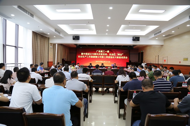 会议宣读新中国成立70周年庆祝活动和第16届中国—东盟博览会、中国—东盟商务与投资峰会期间安全生产工作方案,传达集团公司根治欠薪专项整治行动会议精神,部署第三季度检查工作相关事宜。相关处室负责人对公司第三季度检查重点分别进行交底。