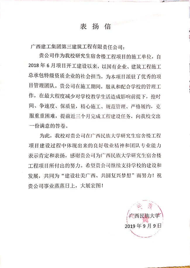 9月10日,广西建工集团第三建筑工程有限责任公司收到广西民族大学发来的一封表扬信。信中对公司、负责施工的第九分公司在广西民族大学研究生宿舍楼工程项目建设过程中体现出来的敬业精神和团队专业能力予以肯定和表扬。