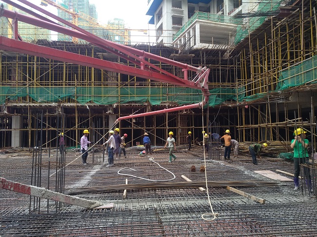 工地上,一片热闹景象,塔吊、混凝土车、钢筋切割机隆隆作响,建筑材料分类堆放,车辆通道畅通无阻。高高的塔吊正起吊着钢材,工人们忙着扎制钢筋、浇筑墙体和楼板、搭建浇筑混凝土的模板,整体建筑已初见雏形……