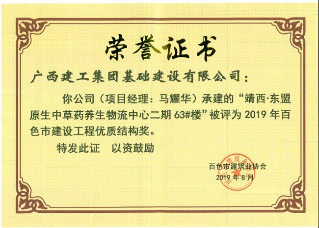 日前,广西建工集团基础建设有限公司柳州分公司承建的靖西•东盟原生中草药养生物流中心二期63#、64#、66#楼项目工程荣获2019年度百色市建设工程优质结构奖,实现工程质量奖项“零突破”。