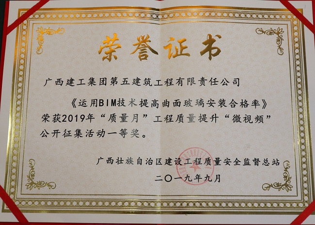 9月18日,第十一届广西建设工程质量论坛暨现场观摩会在百色市举行。会议表彰荣获自治区2019年“质量月”工程质量提升“微视频”公开征集活动中的优秀作品,广西建工集团第五建筑工程有限责任公司作品《运用BIM技术提高曲面玻璃安装合格率》荣获一等奖。
