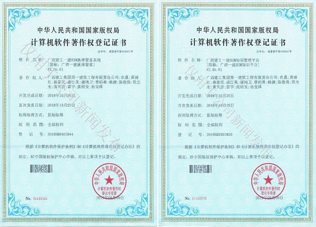 近日,广西建工集团第一建筑工程有限责任公司自主研发的《广西建工一建BIM族库管家》和《广西建工一建BIM知识管理平台》获国家版权局授予的计算机软件著作权登记证书,这是公司首次获得计算机软件著作权。