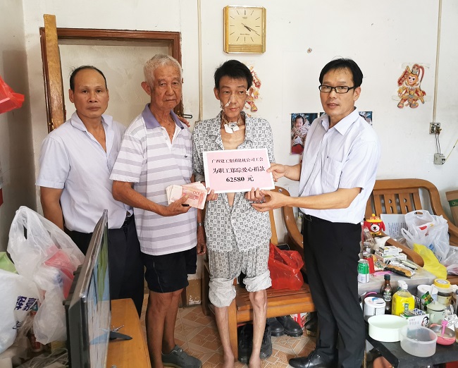 9月29日,广西建工集团建筑机械制造有限责任公司纪委副书记、工会副主席、组织人事处处长莫宇代表公司慰问患病职工郑琮,为正与病魔抗争的他送去爱心捐款。