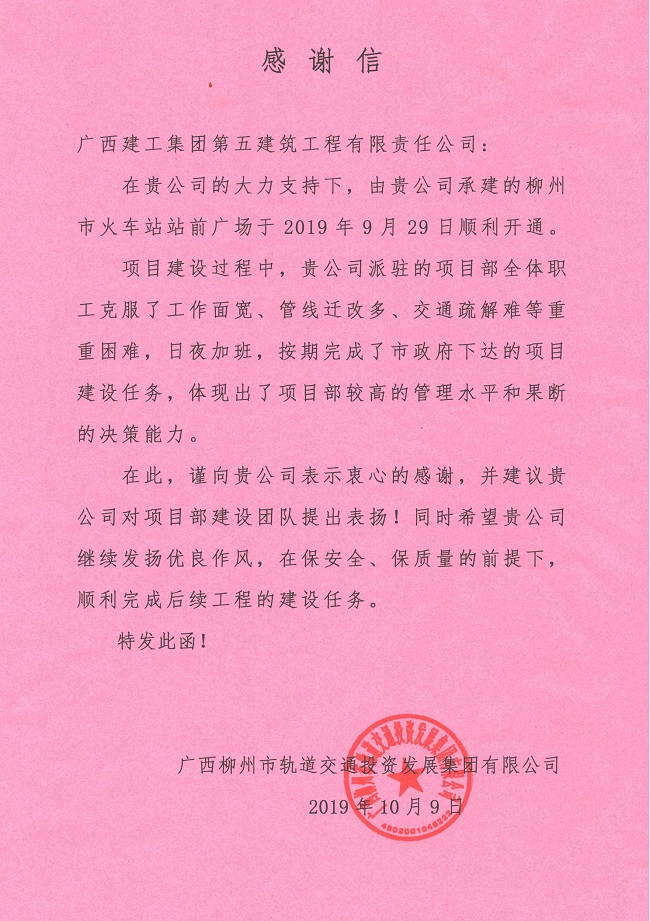 10月9日,广西建工集团第五建筑工程有限责任公司收到柳州市轨道交通投资发展集团有限公司的感谢信,对公司和项目团队在承建柳州市火车站站前广场项目给予高度评价和表示感谢。