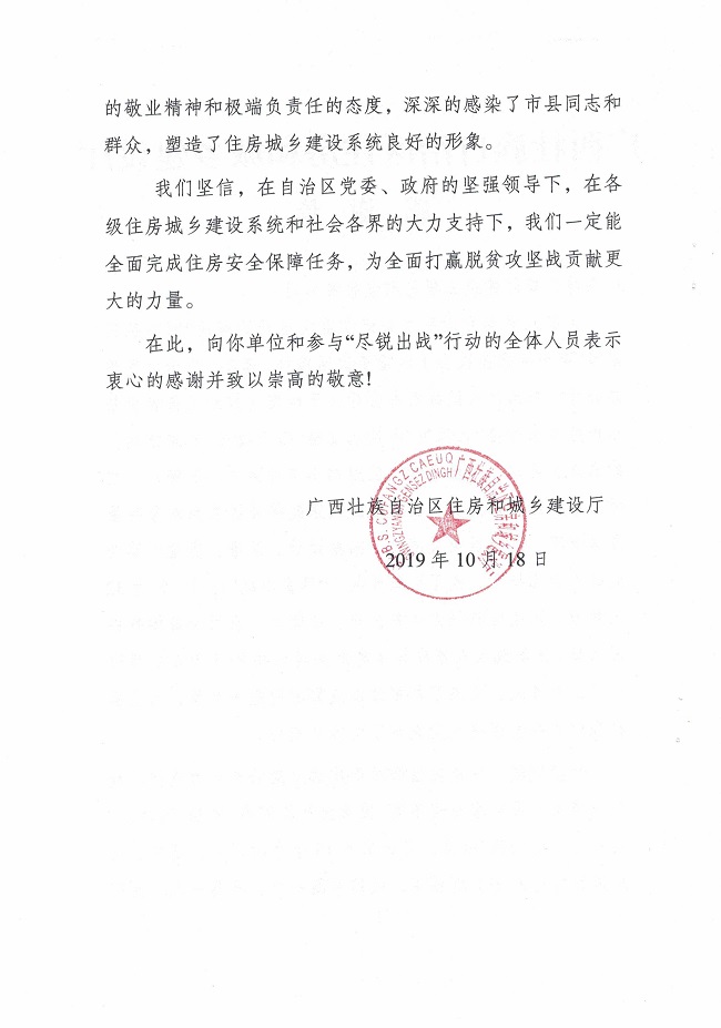 日前,广西 建工集团建筑工程总承包有限公司收到自治区住房和城乡建设厅感谢信,向公司和公司派出参与“尽锐出战”行动的全体人员表示衷心感谢并致以崇高敬意。