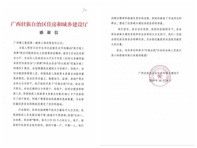 近日,广西建工集团第一建筑工程有限责任公司收到自治区住房和城乡建设厅的感谢信,向公司和公司派出参与“尽锐出战”行动的全体人员表示衷心感谢并致以崇高敬意。