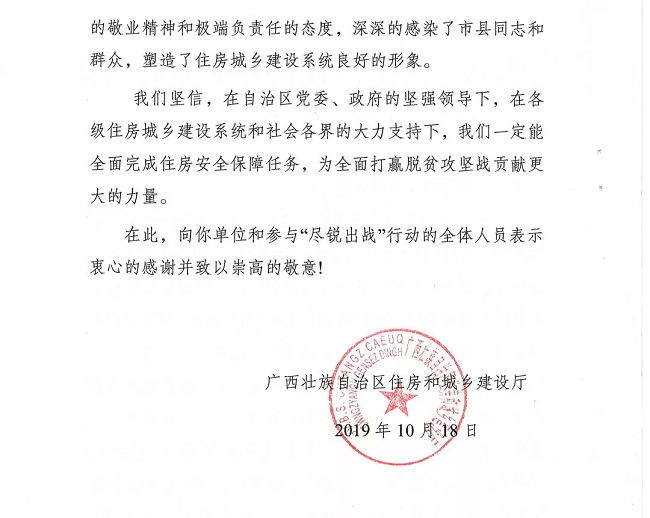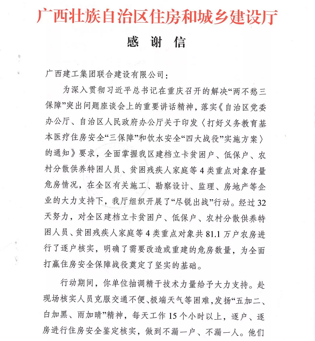 近日,广西建工集团联合建设有限公司收到了来自自治区住房和城乡建设厅的感谢信,信中对公司抽调精干技术力量参加“尽锐出战”行动的积极贡献给予充分肯定并表示感谢。