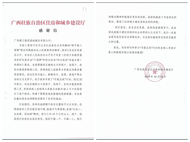 近日,广西建工集团基础建设有限公司收到自治区住房和城乡建设厅的感谢信,向公司参与自治区住房和城乡建设厅开展的“尽锐出战”行动的全体人员表示衷心的感谢并致以崇高的敬意。