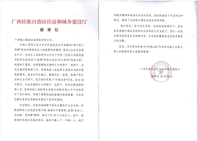 近日,广西建工集团冶金建设有限公司收到广西壮族自治区住房和城乡建设厅的感谢信,向公司参与“尽锐出战”行动的全体人员表示衷心感谢。