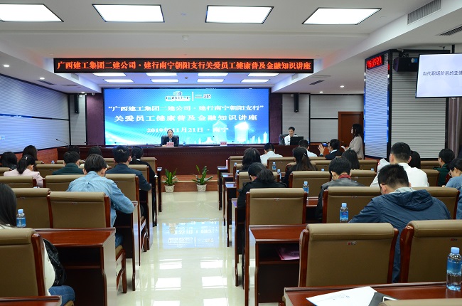 11月21日,广西建工集团第二建筑工程有限责任公司联合中国建设银行南宁朝阳支行在建工大厦2号楼912会议室举办“关爱员工健康 普及金融知识”讲座。