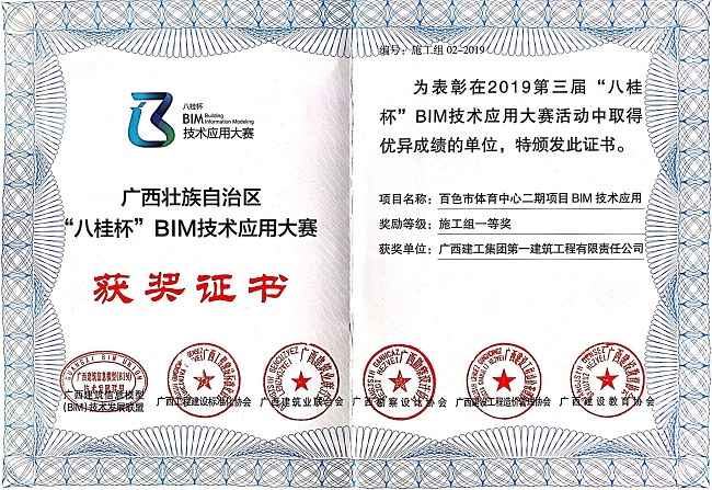 11月28日,自治区2019第三届“八桂杯”BIM技术应用大赛优秀成果介绍暨颁奖大会在南宁举行,广西建工集团第一建筑工程有限责任公司荣获施工组一等奖等三项奖项。