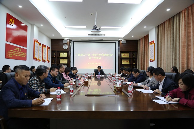 12月13日,广西建工集团第一建筑工程有限责任公司“新时代文明实践所”揭牌仪式在2605会议室举行,公司党委书记、董事长蒙贵飞,党委副书记、纪委书记、工会主席黄远奇共同揭牌。总工程师谢鸿卫、副总经理牙高峰、安全总监邱秋华出席。