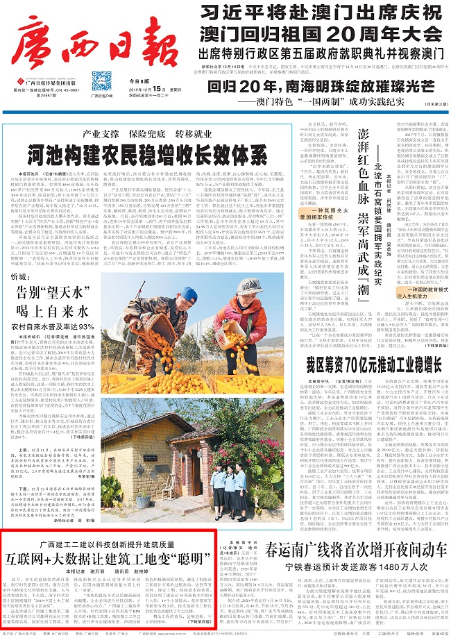 12月15日,《广西日报》头版以题为“广西建工二建以科技创新提升建筑质量 互联网+大数据让建筑工地变‘聪明’”为题,报道广西建工集团第二建筑工程有限责任公司科技创新的做法及成效。