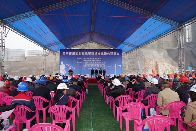 12月25日,由南宁市住房城乡建设局与南宁市建筑质量安全管理中心联合主办,广西建工大都租赁有限公司承办的南宁市塔式起重机安装标准化操作观摩会在五建公司承建的广西体育教科训一体化基地项目一期工地举办。南宁市建筑机械设备租赁行业协会会长、广西建工大都租赁有限公司董事长黄安权主持并宣布观摩会开始。南宁市建筑管理处设备站站长谢晋桂出席观摩会。