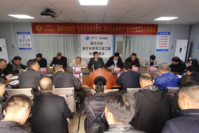 12月27日,广西建工集团基础建设有限公司党委在海河公司那平江项目部召开以“弘扬爱国奋斗精神、建功立业新时代”为主题的党内外知识分子座谈会。公司党委书记、董事长黎平山出席并讲话,党委副书记、纪委书记、工会主席韦志勇主持会议。