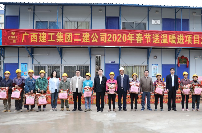 1月2日至9日,广西建工集团有限责任公司副总经理、二建公司党委书记、董事长赖榆和公司其他领导班子成员徐木新、黄志坚、苏维明、卢军宝、卫奕忠、叶彤、覃伟、黄元华、袁小军先后率队深入项目部开展2020年春节送温暖进项目走访慰问活动。