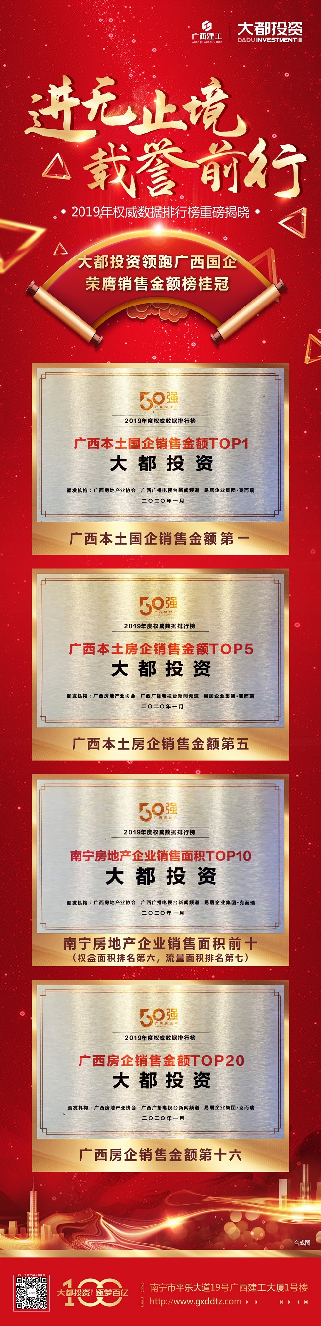 1月9日, 2019年广西房地产行业盛典暨市场数据排行榜发布会在南宁国际会展中心豪生酒店举行。广西大都投资有限公司以61.15亿元的销售额(不含区外项目)排名2019年度广西本土国企房地产销售第一名、广西本土房企销售第五名、广西房企销售第十六名。公司党总支书记、董事长邓少新荣获2019年度广西房地产行业领军人物。