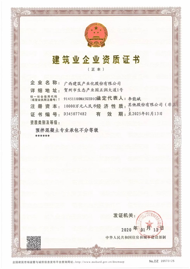 广西建筑产业化公司取得预拌商品混凝土专业承包资质