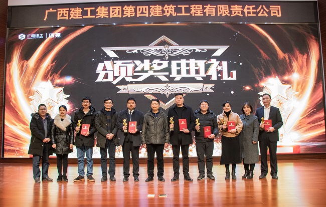 近日,广西建工集团第四建筑工程有限责任公司第二届“管理好手”表彰大会在新落成的总部礼堂举行。公司党委副书记、纪委书记、工会主席余耀森出席并为“管理好手”颁发奖杯和证书。