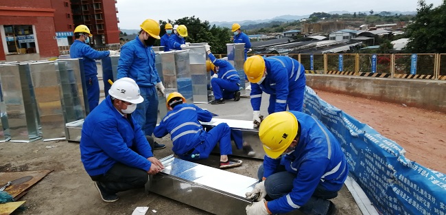 2月9日一早,分公司项目管理人员、劳务公司负责人、安全中心负责人及自有生产骨干等30人赶赴现场,投入攻坚战,施工队伍中的党员和入党积极分子组成党员突击队,充分发挥党员冲锋在前的先锋模范作用,主动对接现场工作范围和要求,争分夺秒进行技术、安全交底和物资调配,克服施工现场交叉作业人员多、作业面狭窄等诸多困难。除按原定工作量完成屋顶空调通风管道安装,还在待料期间协助兄弟单位加工风管部件,完成后续增加的室内空调新风进口和回风口,包括室内顶棚开孔、风口框架安装、滤芯安装和盖板安装等工作内容,圆满完成集团交付的紧急任务。