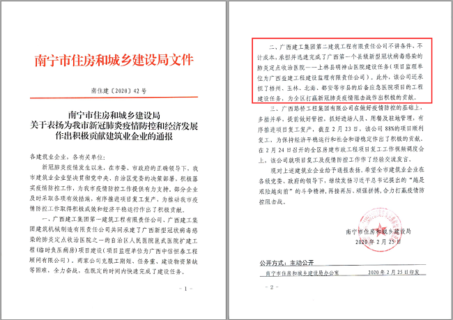 近日,南宁市住房和城乡建设局印发《关于表扬为我市新冠肺炎疫情防控和经济发展作出积极贡献建筑业企业的通报》,对广西建工集团第二建筑工程有限责任公司不讲条件、担当负责,迅速完成广西第一个县级新型冠状病毒肺炎定点收治医院——上林县明神山医院建设任务给予通报表扬。