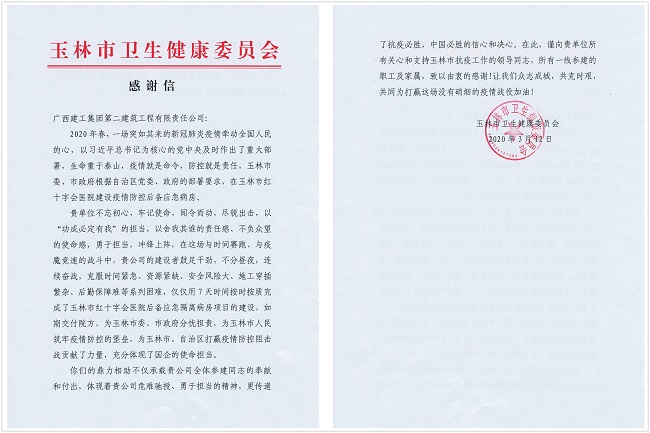3月12日,广西建工集团第二建筑工程有限责任公司收到玉林市卫生健康委员会的感谢信,对公司按时按质完成玉林市红十字会医院后备应急隔离病房项目建设表示感谢。
