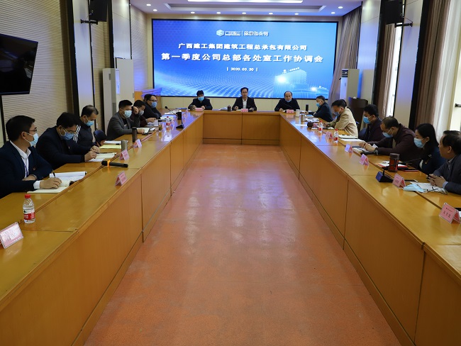 3月30日,广西建工集团建筑工程总承包有限公司在13楼会议室召开2020年一季度总部各处室工作协调会。公司党委书记、董事长陈祖训出席并讲话,党委副书记、总经理陆烜主持。领导班子成员岑廷义、张强、林平均、曾劲松、周兴耀、陆美豪参加。