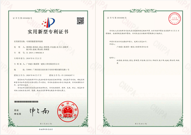 近日,广西建工集团第一建筑工程有限责任公司申报的实用新型专利《一种可调型箍筋笼焊接架》荣获国家知识产权局授权。