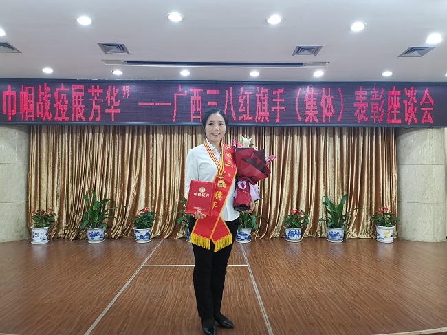 4月22日,自治区妇联、自治区卫生健康委举办“巾帼战疫展芳华”——广西三八红旗手(集体)表彰座谈会。广西建工集团第一建筑工程有限责任公司女职工黄任秋作为广西建筑企业唯一一名获奖代表,在会上被授予疫情联防联控工作“广西三八红旗手”荣誉称号。