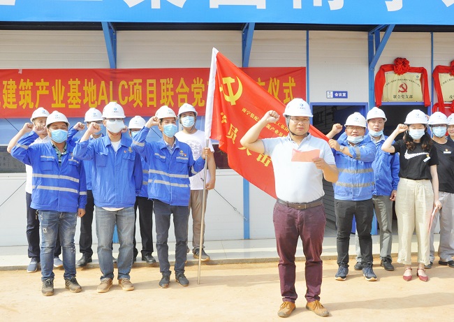 黄洪指出,南宁装配式建筑产业基地ALC项目是自治区层面统筹推进的重大项目,两家兄弟单位选择在项目攻关的关键时刻联合成立党支部,整合几个单位力量,建立一支以党员为主体,入党积极分子和优秀青年主动参加的党员突击队,既是贯彻落实集团公司党委“两上”要求和党建“筑星工程”的要求,也是构建兄弟单位“党建共促、问题共商、资源共享、活动共办、发展共谋”党建共建格局的好形式。他对项目联合党支部和党员突击队提出四点要求。一是互相促进,共同提高。项目联合党支部和党员突击队成立后,要发挥党建引领作用和团队优势,共同谋划项目建设、协商解决问题,做到思想政治建设与经济中心工作相结合、专业分工与集体作战相结合、发挥党员先锋模范作用与调动广大职工积极性相结合等三个结合,实现进度、安全、质量、成本和按时投产等五个目标。二是时不我待,只争朝夕。党员突击队是一面旗帜,党员领导人员要扛好旗、掌好舵,做新时代党员和优秀青年的楷模,立足岗位,努力工作,出色完成项目建设各项任务。三是打造人才培养阵地。在项目实施过程中,项目党支部要推进新技术、新工艺的引进和使用,达到降本增效提速的目的,加强项目人才队伍建设,培养一批有创新意识、有实践能力的人才队伍。四是创造更多更实业绩。攻坚二季度,冲刺上半年,确保6月底实现项目试生产,创建安全文明工地和优质工程、钢结构金奖。