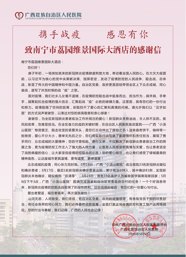 近日,广西荔园饭店投资有限公司收到广西壮族自治区人民医院感谢信,对公司慰问自治区人民医院邕武医院临时应急病房一线医护人员及爱心捐赠表示感谢。