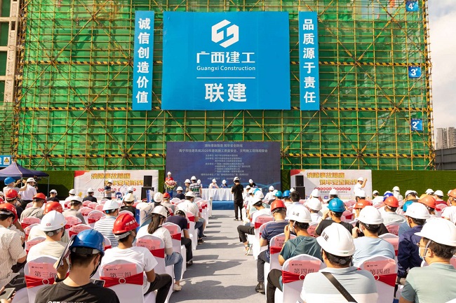 6月12日,南宁市住建系统2020年建筑施工质量安全、文明施工现场观摩会在广西建工集团联合建设有限公司承建的南宁民族大饭店项目举行。南宁市住房和城乡建设局副局长黄赞、南宁市建筑质量安全管理中心主任钱强、南宁市建设工程质量安全协会会长李寿坤以及联建公司党委书记、董事长陆彪出席。