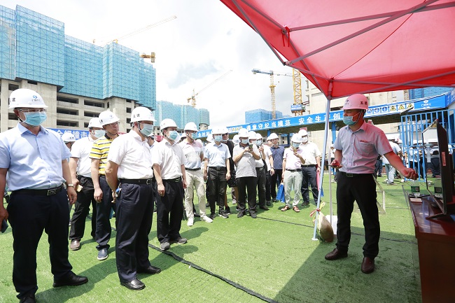 与会人员集中观看综合应急救援演练,并到项目质量样板展示区、安全教育培训体验馆、安全生产管理信息化展区、班前教育室、样板区等展示区参观,对铝模和爬架、临边监控预警系统、塔吊4合一监控系统、物联网消防预警系统等进行观摩,参观学习项目施工规范化、安全管理科学化、安全防护标准化、场容场貌秩序化的经验。
