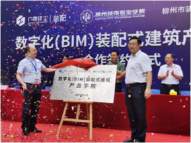 6月23日,广西建工轨道装配式建筑产业有限公司与柳州城市职业学院、柳州市装配式建筑产业协会举行合作签约仪式,三方携手共建数字化(BIM)装配式建筑产业学院。柳州市教育局副局长温剑,柳州市装配式建筑产业协会会长、公司党总支书记、董事长秦元,公司党总支副书记、总经理覃幼辙,柳州城市职业学院院长谢名洋、副院长刘洪波出席。