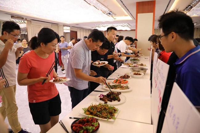 来自公司各部门及子公司共19名代表参赛。比赛中,参赛选手充分展示自己的精湛厨艺,争分夺秒进行美食制作,现场热闹非凡。在约一个小时的紧张“角逐”下,陆续出品了酸辣鸡脚、可乐排骨、卤猪蹄、白切鸡等各式各样的美味菜肴。看着色香味俱全的“劳动成果”,现场人员垂涎欲滴。通过收集公司领导、职工组成的大众评委的点赞数,综合办公室“滚地龙”荣获一等奖;结算中心“智慧维度”、企业管理部“笑口常开”荣获二等奖;财务部“泡到你撒娇牛肉”、壮智文化“无名猪蹄”“金角锅包肉”荣获三等奖。