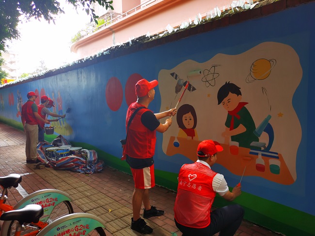 6月29日,广西建工金控投资有限公司“团小金”青年服务队走进西乡塘区秀灵路西一里开展创城志愿者服务活动,用自己手中的画笔,把社会主义核心价值观“绘”上墙,向市民传递共创文明城新风尚,以实际行动投身到创建文明城市活动中。