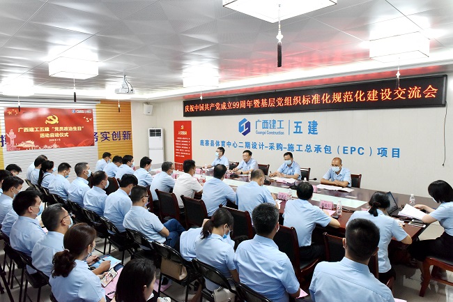 7月1日,广西建工集团第五建筑工程有限责任公司党委在鹿寨县体育中心二期项目部会议室召开庆祝中国共产党成立99周年暨基层党组织标准化规范化建设交流会,回顾党的奋斗历程和光辉历史,讴歌党的丰功伟绩,总结谋划公司党建工作。公司党委书记、董事长黄鼎龙出席并讲话,党委副书记、总经理蒙勇,副总经理何显文出席,党委副书记、纪委书记、工会主席彭业波主持。