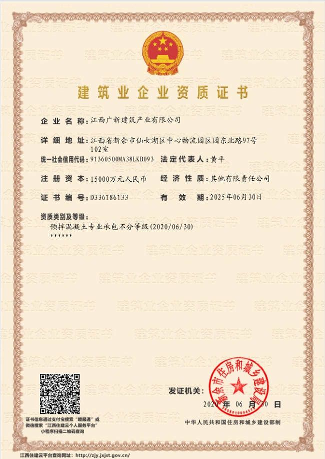 7月1日,江西广新建筑产业有限公司顺利取得新余市住房和城乡建设局颁发的预拌商品混凝土专业承包资质,标志着广新公司今后可对外生产、销售各种强度等级的混凝土。