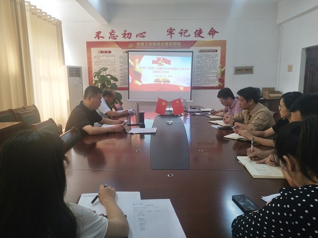 7月3日,广西建工海螺贸易有限责任公司党支部在公司会议室开展主题党日活动,公司党支部书记、董事长卿勇出席并讲话,副总经理兼财务总监黄顺根参加。